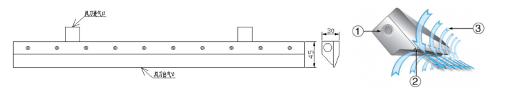 ③而形成一面薄薄的高強度、大氣流的沖擊氣幕,氣幕強非常均勻。氣刀具有噪音低(69db)分貝以下,耗氣量少,表面經(jīng)過電鍍氧化處理,使用壽命10年以上,用起來節(jié)省90%以上等優(yōu)點。